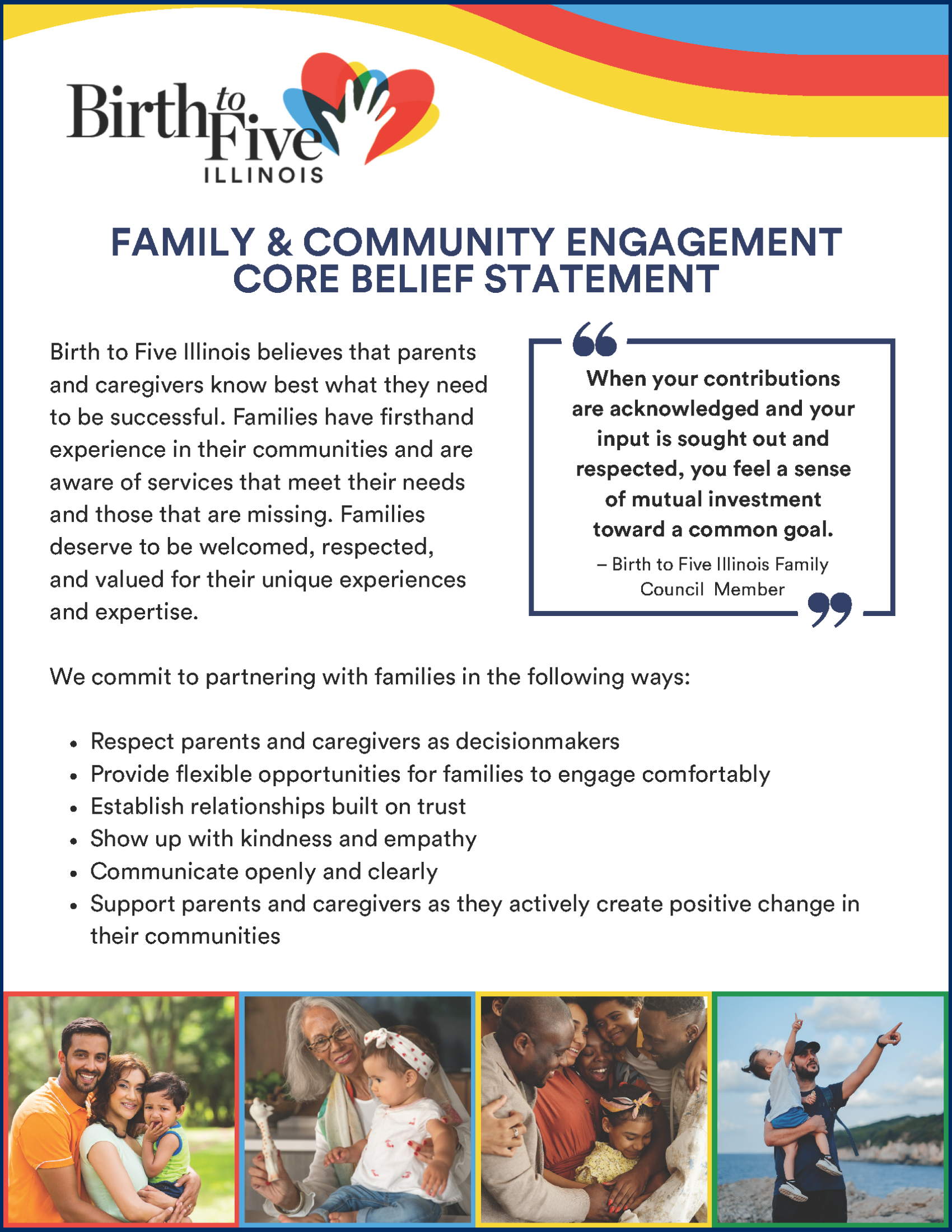 The Family & Community Engagement Core Belief Statement was developed to better reflect the unique role of family and community engagement at Birth to Five Illinois. The Team surveyed FACE Specialists and Council members to define family and community engagement in their own words.