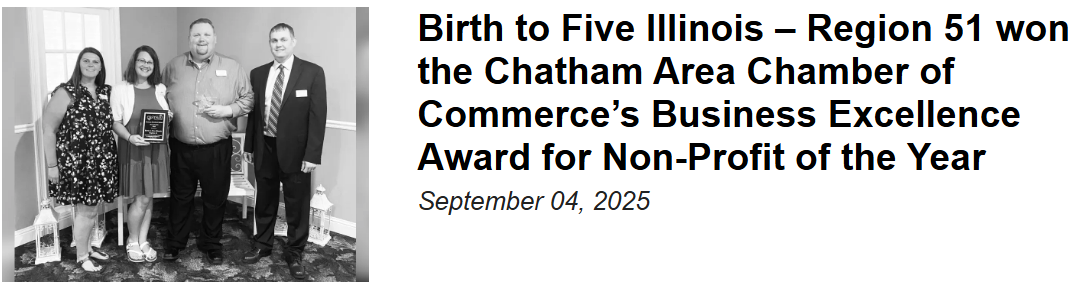 Birth to Five Illinois: Region 51 Won the Chatham Area Chamber of Commerce’s Business Excellence Award for Non-Profit of the Year 51 Sep 4 Written By Guest User September 4, 2025Original coverage in the South County Publications (Auburn Citizen, Chatham Clarion, New Berlin Bee, Rochester Times). Guest User